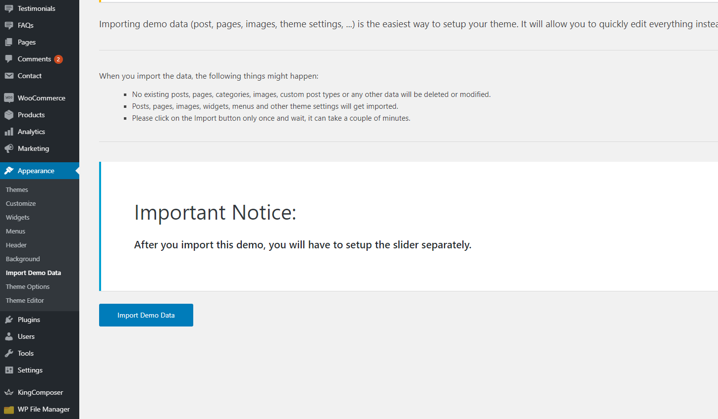 After theme activate, a new page appear. If not appear, then goto Appearance > templatepath Demo Import.